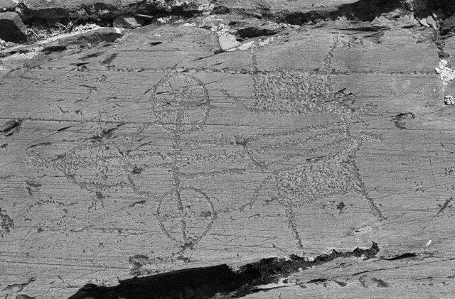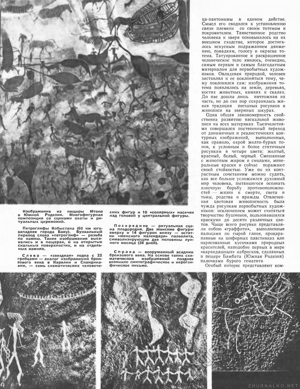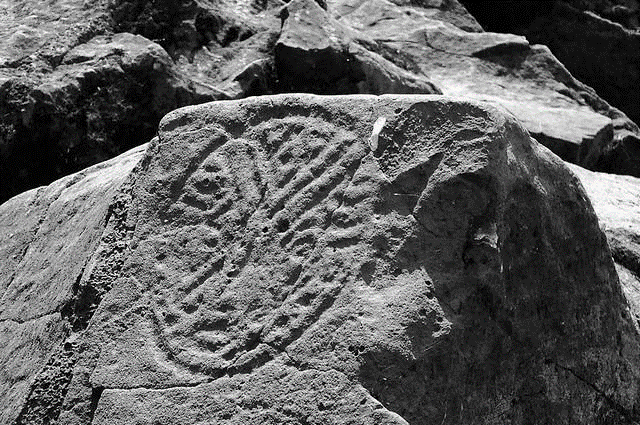 Петроглифы. Гобустан. Азербайджан. III-II тыс. до н.э. Слева: лодка с рыбаками, ниже фигурки мужчин в набедренных повязках с луками, гарпунами и верёвкой (?), рядом с головой одного из них, возможно, приспособление для нанизывания пойманной рыбы. Посередине: изображение девушки и беременной женщины, а под ними «хоровода» из 14 детей — символ половины «женского месяца» в 28 дней. Справа: вооруженный всадник